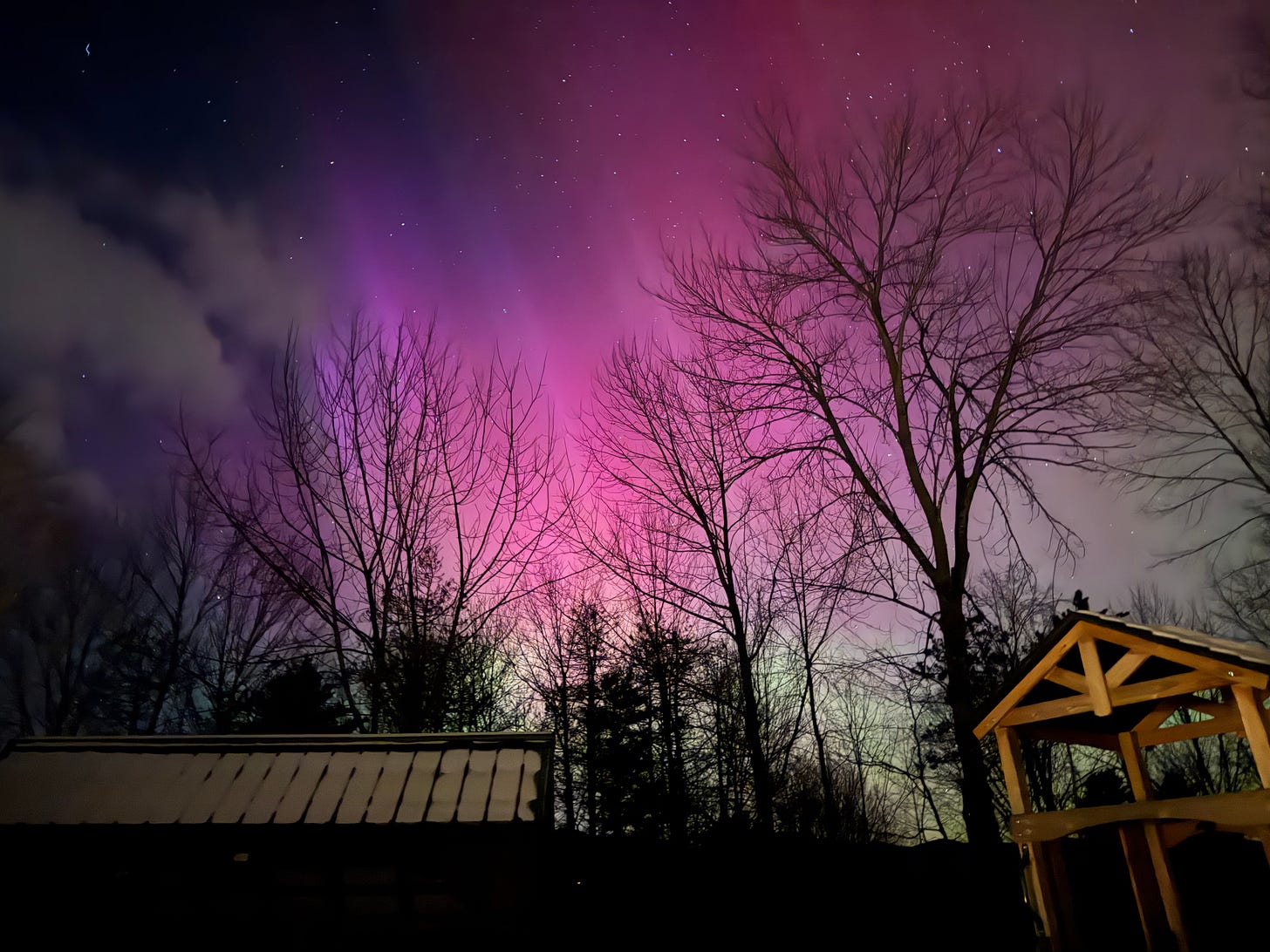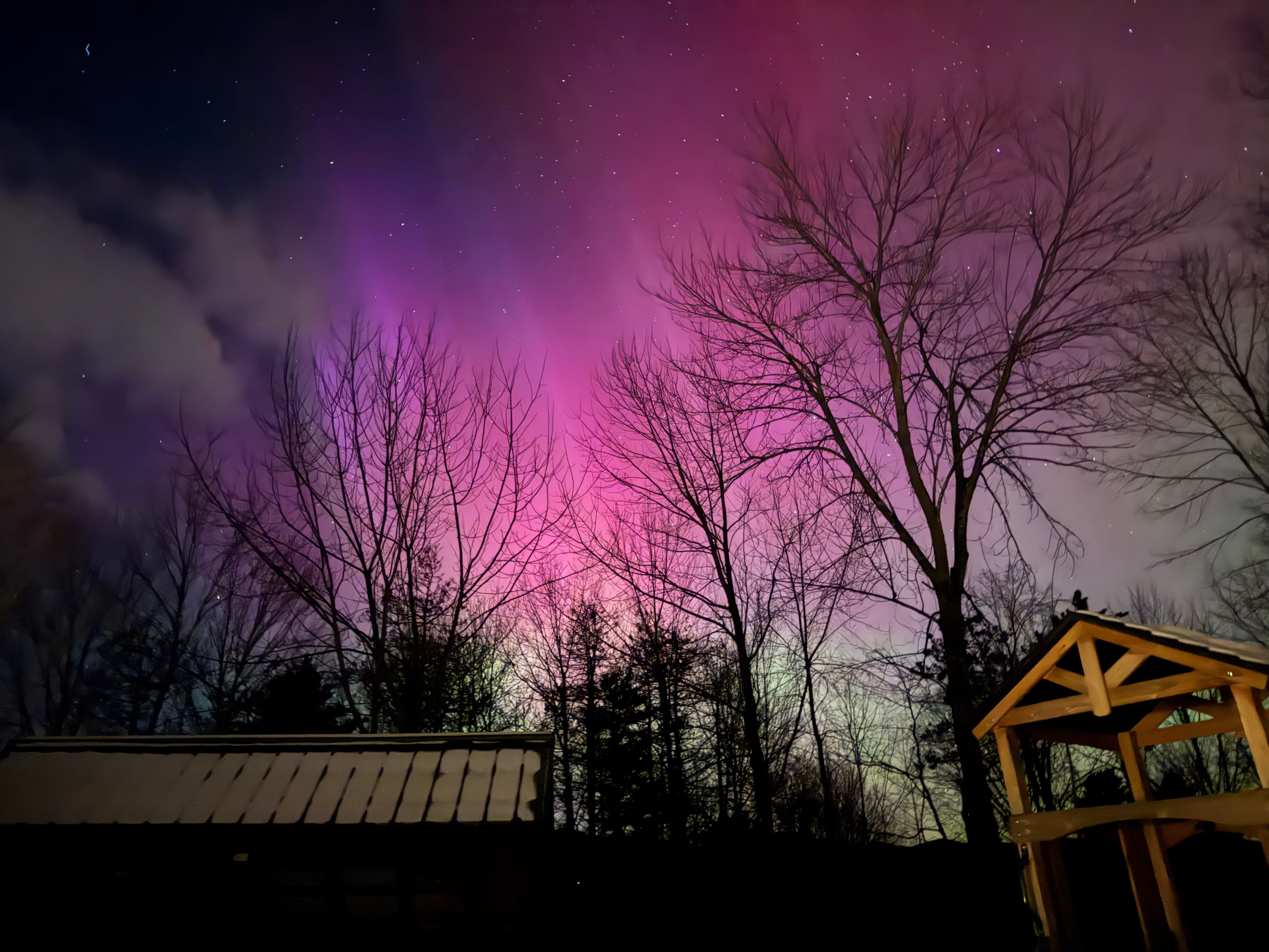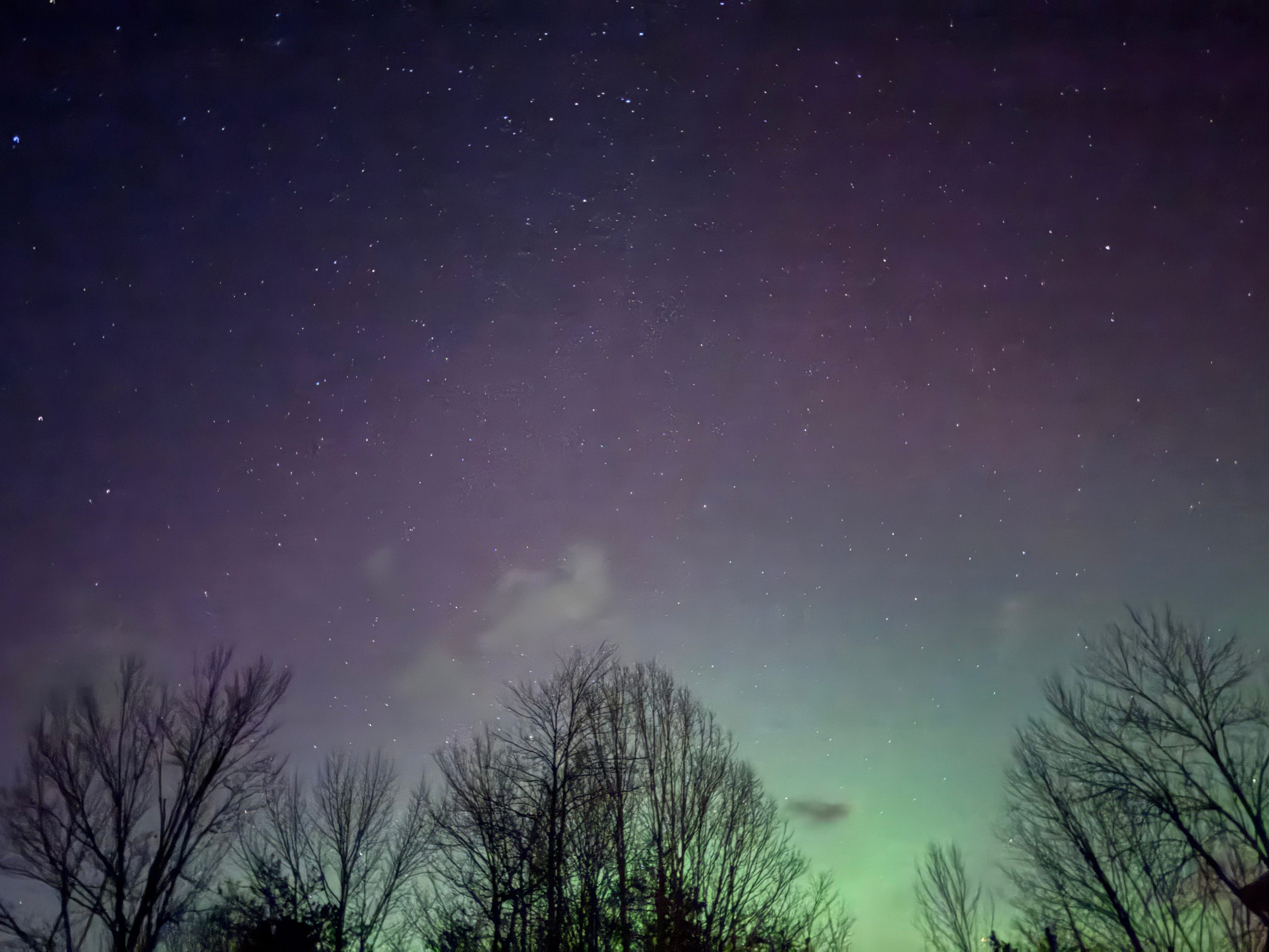 Tonight, tonight, tonight, tonight. The veil lifted. They glitter and sparkle and dance. Colors of fuchsia and raspberry swirl in one direction and north, pillars of green light beam skyward. The gathering dark in every other direction.